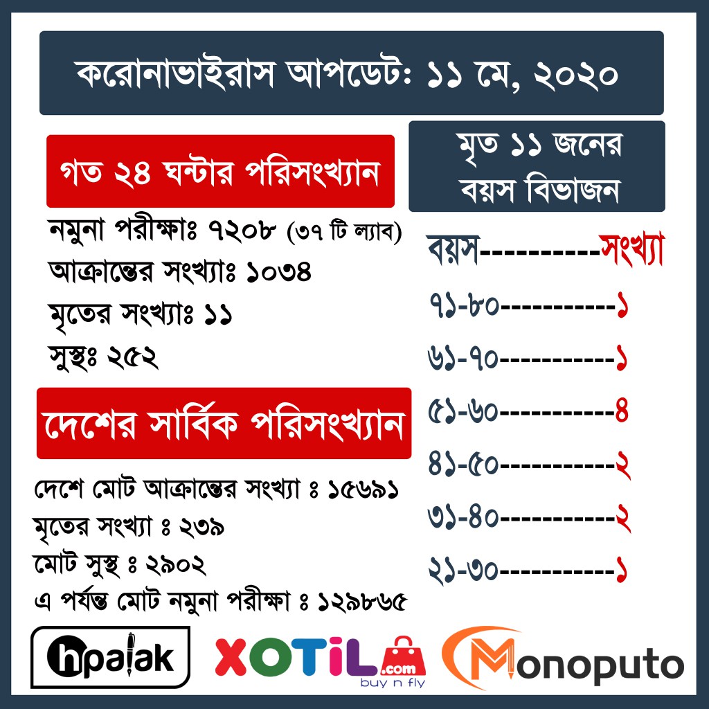 দেশে রেকর্ড গত ২৪ ঘন্টায় ১০৩৪ জন নতুন করোনাভাইরাসে আক্রান্ত। মৃত্যু ১১।